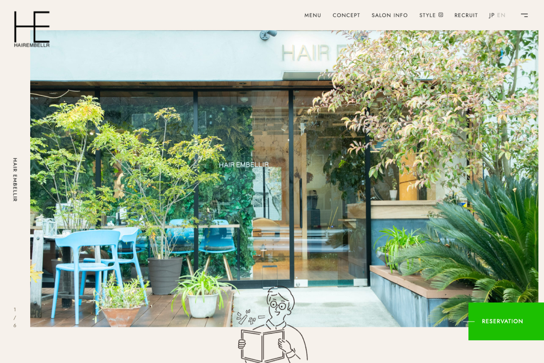 奈良の美容室HAIR EMBELLIRさまのwebサイトをデザインいたしました。 シンプルなサイトなのでアクセントにパラパラ漫画のような少し動くイラストを使ったデザインです。